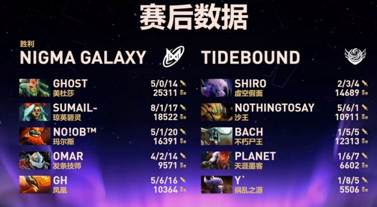 第二局NTS选出中单沙王但直接被Sumail奶绿对位单杀!Nigma再次三路线优开局!中单对线期的对位差距1200块了!13分钟NTS跳刀第一波吃了发条+奶绿沉默大都没放就没了!Nigma击杀TBD四人拉开经济差!随后TBD偷肉山失败团战大败,Ghost美杜莎带盾早早站上TBD高地!最后的高地团TBD毫无输出,拿这个美杜莎毫无办法啊!Nigma结束比赛晋级败者组下一轮,TBD则是被淘汰出局!