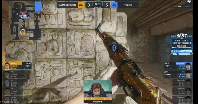 第一局PR单A先拿首杀!TYLOO四人占据A区成功下包!PR三杀这边JamYoung也双杀!但是GL封烟开拆,Tauson双杀掩护住了队友!9-4!