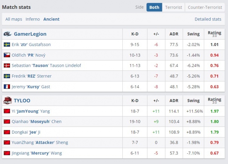 图二来到GL选择的Ancient,开局Jee手枪局就三杀立功,不过PR借助REZ发的英雄AK四杀秒翻带队咬住比分。随后TYLOO双J组合+Moseyuh全在乱杀,第十回合Moseyuh四杀刷屏,第十一回合JamYoung回防三杀拒绝对手翻盘,上半场最后一局Jee大狙炸烟一穿二后帮助TYLOO半场又拿9分!