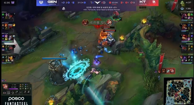 【18:01】KT轻松拿下听牌龙!随后Deokdam芸阿娜中路装逼被逮捕,但是Cuzz皇子赶到,KT正面形成多打少分割战场先留GEN上野,Cuzz皇子闪现盖大强杀掉了Ruler斯莫德!KT的1换3!