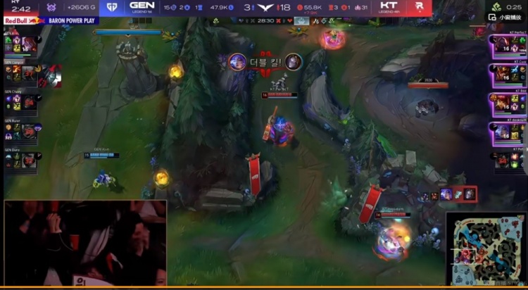【28:13】GEN抱团开大龙,但是被Cuzz皇子打果子进龙坑直愣愣抢到了大龙!随后Ruler斯莫德被开,自己交出保命打出伤害还是阵亡!正面GEN阵型直接被冲散!KT击杀GEN四人,仅仅28分钟就一波结束首局比赛!
