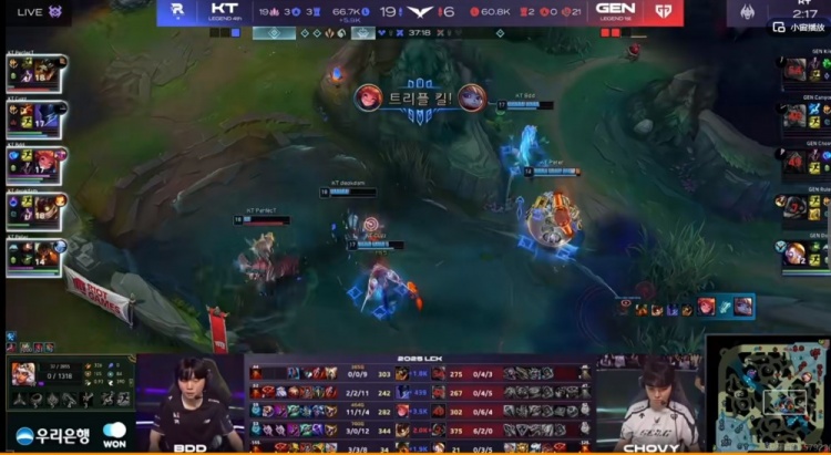【11:21】河道遭遇Duro机器人先手,虽然GEN先手强杀Peter泰坦让Ruler库奇拿下一血!但是Cuzz梦魇关灯开飞,Bdd佐伊也有线权支援,这波KT打出1换2!