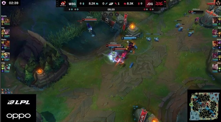 【14:05】WBG入侵JDG野区,小天被Xun蔚锁头秒杀,随后JDG入侵WBG野区,刘神卡尔玛直接被Peyz秒杀,Light送Peyz双杀,Breathe鳄鱼咬掉Xun蔚,JDG打出1换2,经济领先2k。