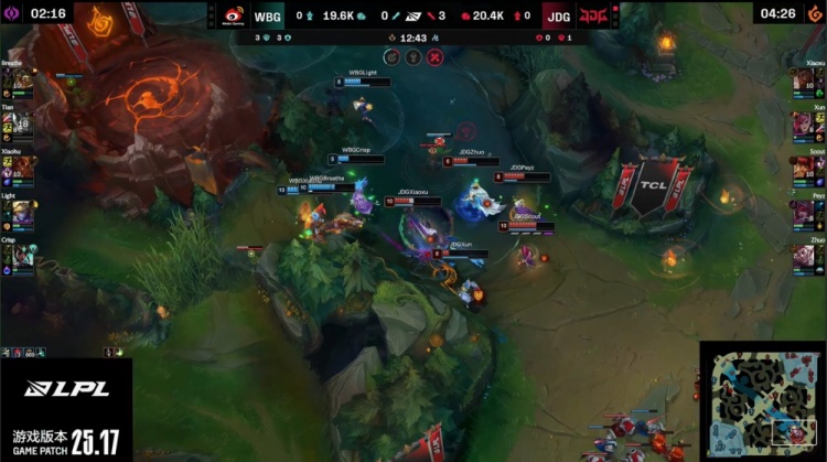 【12:19】小龙团,xiaohu岩雀抬回Xiaoxu奎桑提,后者交出闪现拉开,随后Scout提伯斯拍脸击杀小天赵信,Xiaohu反杀Zhuo与Scout拿到双杀,Xiaoxu奎桑提战至最后击杀没蓝的xiaohu也拿双杀,JDG打出3换5团灭WBG。