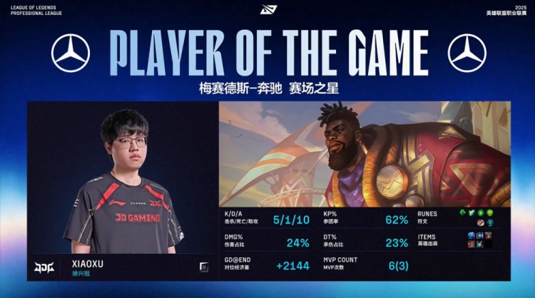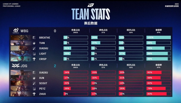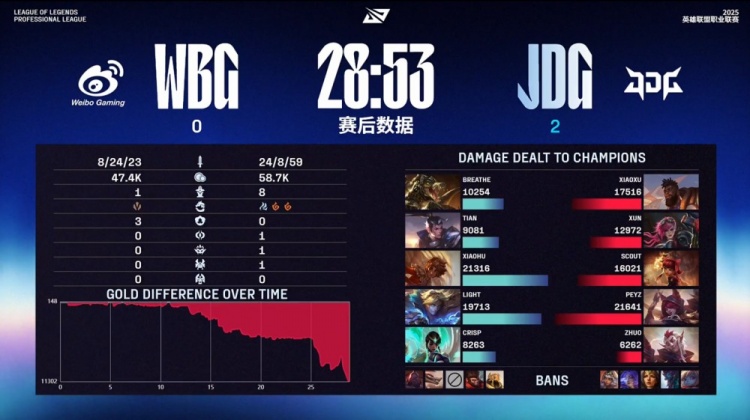 中期JDG在野区连续击杀WBG成员,Xiaoxu奎桑提真正游龙,配合Xun蔚和Peyz霞的强力输出,帮助JDG连战连捷。尽管WBG还手未果,Peyz四杀收尾,JDG一波推平WBG基地,拿到赛点。