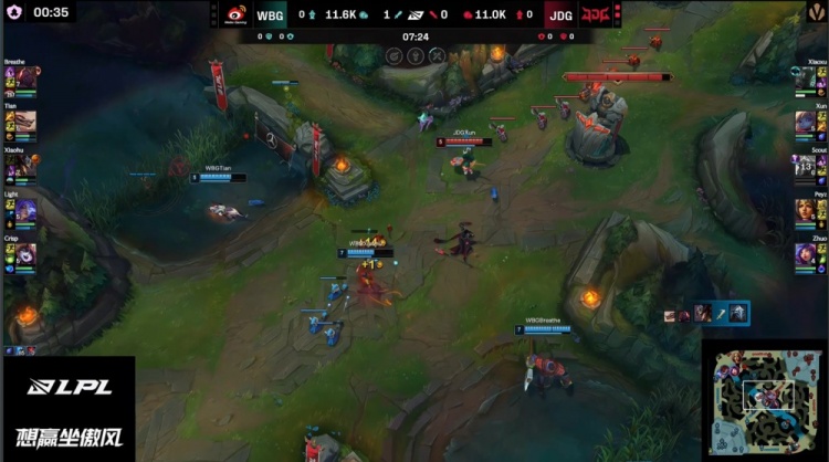 【7:35】Breathe赛恩来中与xiaohu定住Scout维克托,小天冥犬随后来中,WBG上中野合理击杀Scout。