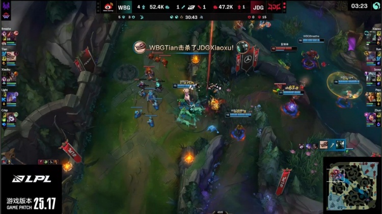 中期厄塔汗团战xiaohu卡牌开大不飞,双方继续峡谷对峙。最终两波大龙团才分胜负,Xiaoxu铁男落单给机会遭Xun冥犬锁头击杀,Light芸阿娜开大斩落Peyz,Scout难逃一死,WBG摧枯拉朽突然杀死比赛,一波团灭JDG后推平基地扳回一城。