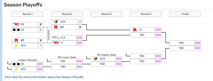 T1和HLE的败者跌入第二轮,交手DK和BFX的胜者,决出LCK的第四个名额。