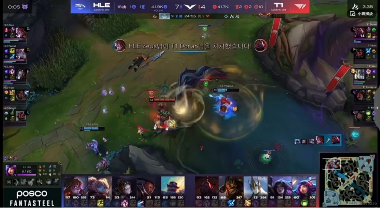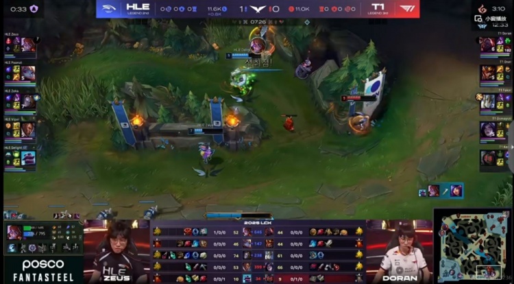 【7:25】Delight布隆提早TP下路支援,Zeus阿萝拉罩大拉扯,T1三人越塔失败还被HLE上辅两人合力击杀掉了Keria妮蔻!一血给到Zeus阿萝拉!