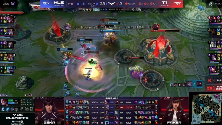 【24:45】厄塔汗团Keria妮蔻闪现开团配合Gumayusi卡莎飞强杀掉了Viper卢锡安!但是Peanut波比拿下厄塔汗!残局Zeka阿萝拉罩大先解决卡莎,随后Peanut波比闪赚腾挪,Faker加里奥E空打不过了啊!HLE打出1换4!回头再拿大龙!Faker加里奥嘲讽进场直接被Peanut波比顶开白给了!随后中路T1强开越塔又是Doran塞恩和Zeka发条互换!