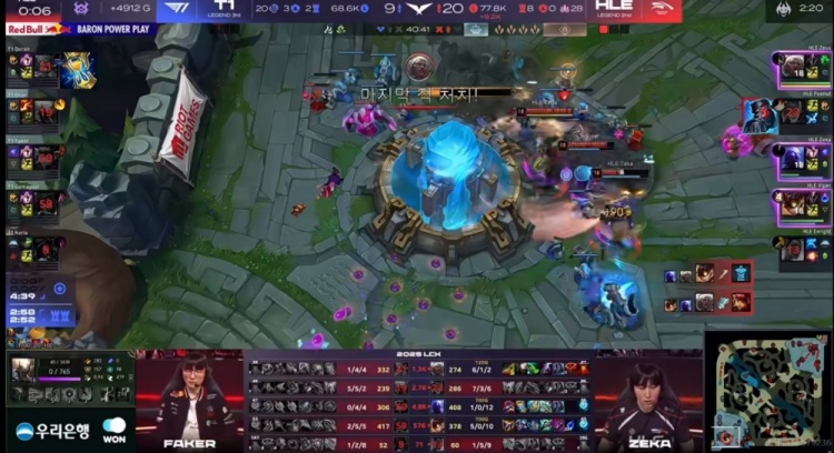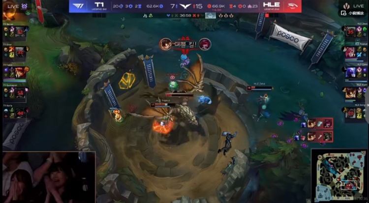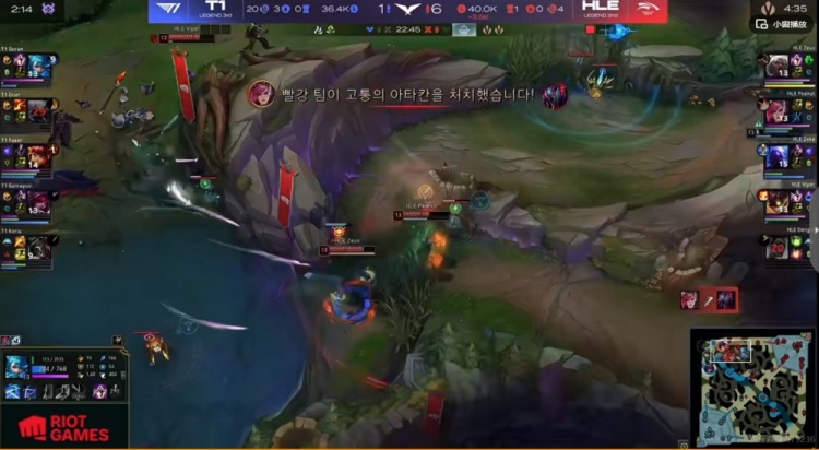 【21:40】HLE三个大招直接配合秒掉了Faker安妮!T1支援到位已经晚了!还留不住人啊!HLE再拿第四条小龙!T1被迫开厄塔汗,但是被Delight芮尔开到的Oner潘森和芮尔互换!T1没打野了啊!Peanut蔚赶到拿下厄塔汗又追死Doran潘森,回头一个大招锁头再配合Zeus安蓓萨留住了Faker安妮!HLE快5K经济优势了!