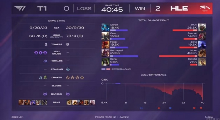 【39:58】高地团HLE越塔秒掉了Keria烈娜塔!T1反击换掉了HLE的野辅!HLE打出2换3!拆掉下路高地!Gumayusi霞被Viper炸弹人追着炸根本活不了啊!HLE拆塔飞快!团灭T1之后结束第二局比赛!