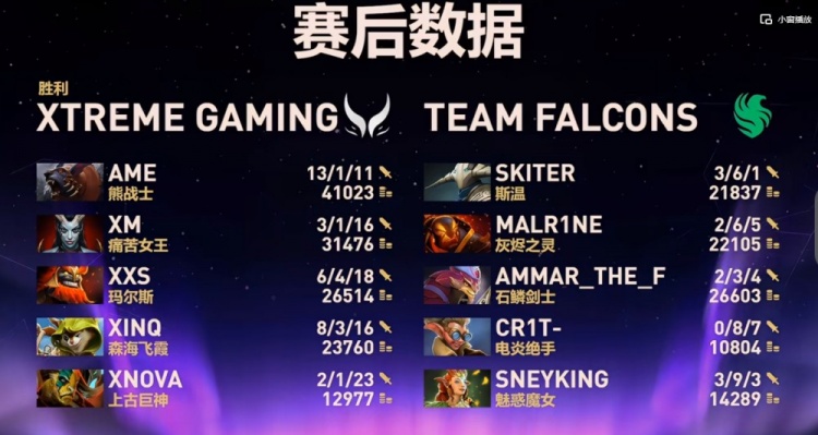 关键的肉山团Malr1ne火猫省BKB直接白给,Xm女王切入战场丝血切了盘子没死!Ame拍拍熊收割战局,XG击杀对手四个!又在高地团逼出对手三个买活之后局势已定!最终团战Falcons三人强杀Xxs马尔斯未果,skiter斯文连续锤有A杖的Ame拍拍有啥用呢!XG先行拿下第一分!