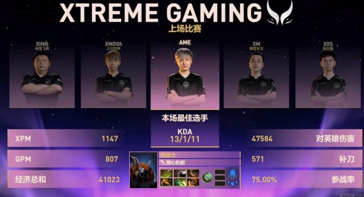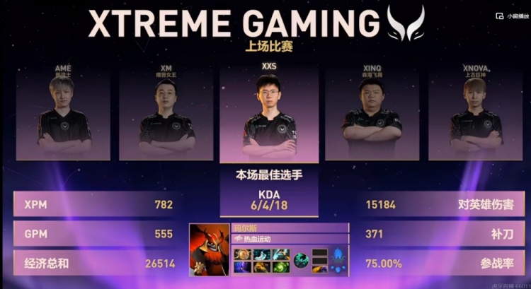 天辉XG:Xxs马尔斯、XinQ森海飞霞、xNova上古巨神、Ame拍拍熊、Xm痛苦女王