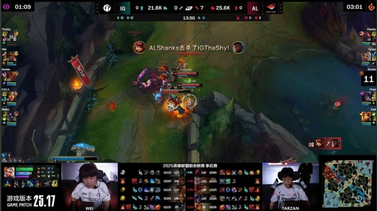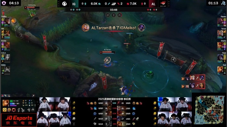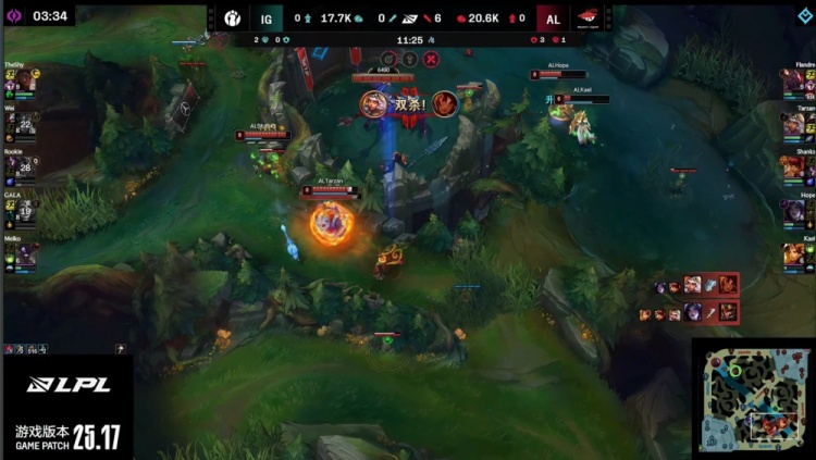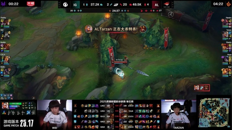 【11:20】河道团战,Tarzan奇亚娜推iG两人,GALA瞬间被Tarzan击杀,王杰飞脸带走Wei,Rookie孤立无援送Tarzan双杀,AL打出0换3,经济领先3k。