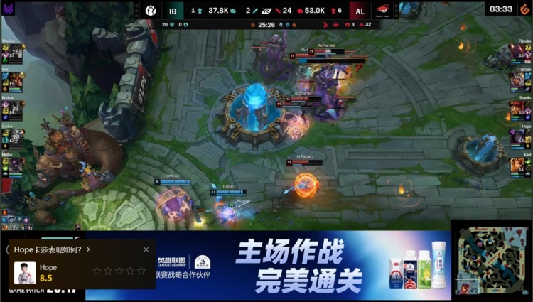 【24:37】Wei自家F6被Tarzan轻松单杀,中路AL推进,Shanks安妮开iG三人,王杰再轰三杀,AL打出0换5团灭iG,一波推平iG基地先下一城。