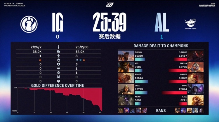 中期小龙团,Flandre赛恩草丛Q飞iG三人,Tarzan再开iG两人,王杰卡莎爆轰三杀,AL打出2换3。随后GALA多次阵亡,Wei在自家F6被Tarzan刷掉,iG毫无一战之力,AL24分钟爆杀速通iG,先下一城。