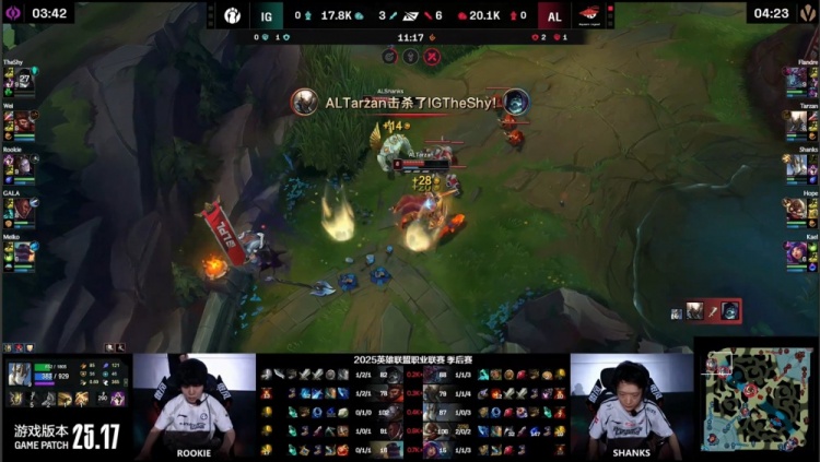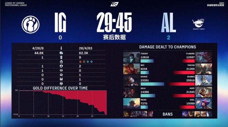 最终iG延续上盘崩盘表现,AL不费吹灰之力推平iG基地,Wei与TheShy战绩合计3-13,AL拿到赛点。