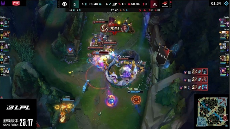 【25:18】龙魂团,iG五人下路被包夹,Kael妮蔻开三人,王杰飞机轻松四杀,AL打出0换4,经济领先1w2k。