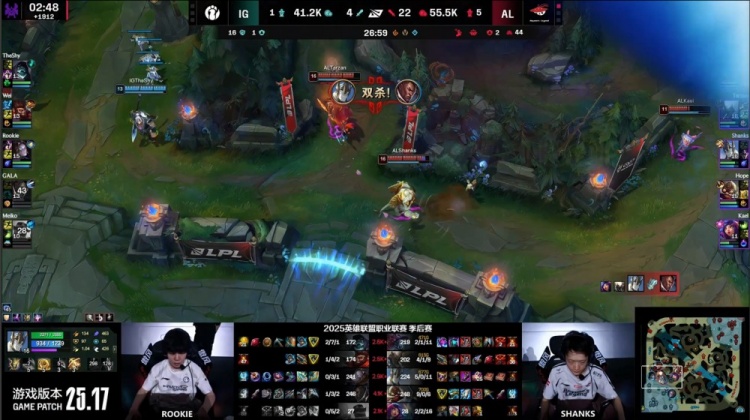 【15:52】AL中路推掉iG一塔,随后Shanks加里奥登场锤飞Wei,Meiko送Shanks双杀,AL打出0换3,经济领先6k。