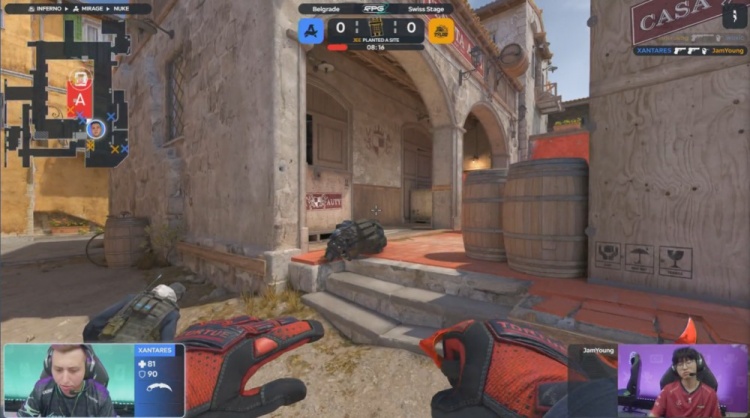 第16局Aurora提速冲A,jottaaa冲进A点双杀,狠人轻松在A下包,Tyloo三人B点保枪,Aurora8-8Tyloo。