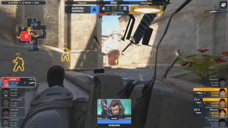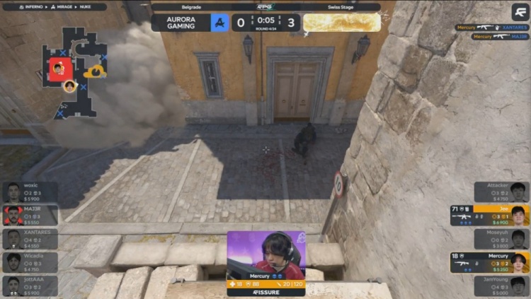 第9局狠人前顶香蕉道烟雾弹,来到中路先杀小鞠,随后绕后狂轰三杀,Mercury补掉狠人,Moseyuh与Mercury两人来香蕉道,Maj3r架过点击杀Mercury,woxic大狙轰掉Moseyuh,Aurora4-5Tyloo。