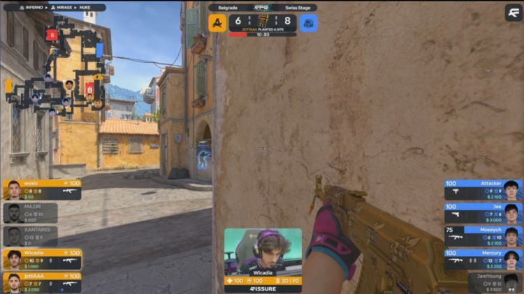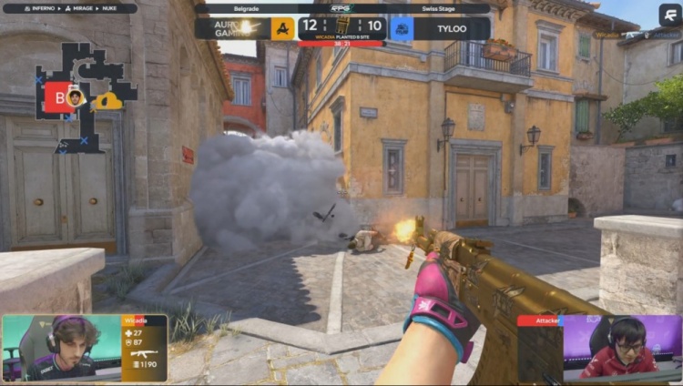 第14局Tyloo半起,小鞠拿起喷子站在香蕉道矮墙,Aurora选择转A,白菜蓝车看A1,Aurora连接进A,Mercury书房双枪双杀,Jee包点击杀Maj3r,woxic与Wicadia两人进A下包,小鞠残局1v2点掉Wicadia后捡到AK保枪,Aurora6-8Tyloo。