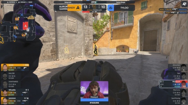 第12局,Wicadia中路反清被Moseyuh击杀,Maj3r香蕉道老位置看过点击杀小鞠,白菜送Maj3r双杀,Moseyuh补枪得手,Tyloo冲B下包,woxic教堂与jottaaa打B包点,Mercury击杀jottaaa,Jee一枪轰掉woxic,Aurora4-8Tyloo。