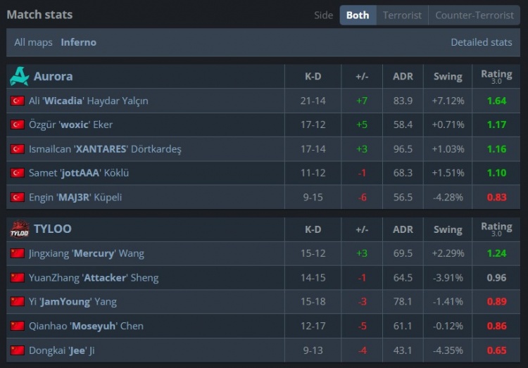 易边再战,手枪局Aurora双杀进B,TYLOO不断保枪,Aurora连拿4分将比分扳为8-8平。次回合woxic大狙收掉2v2残局。第19局Maj3r单局轰出ACE,TYLOO无法赢下三打一残局。第22局小鞠香蕉道双杀并让woxic带走队友Maj3r,Wicadia在B包点爆轰四杀,Aurora拿到赛点。最终jee大狙A二楼前顶送首杀,jottaaa二楼空降打爆A点,Aurora13-10赢下图一。