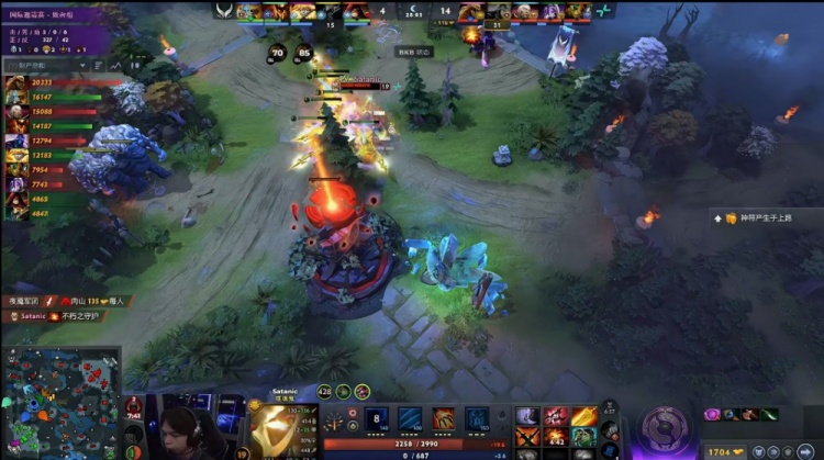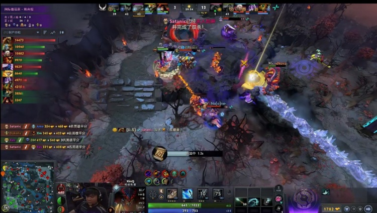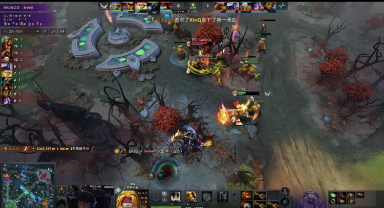 【28分钟】Parivision打肉山,XG开雾过来接团,XinQ司夜刺客进洞被控一手吹风天火直接倒地,侧翼xm影魔也被Dukalis上古巨神踩晕,xxs破晓晨星开大招救影魔,影魔开出BKB摇大反打,DM谜团过来想断影魔大招被击杀,Satanic噬魂鬼打掉肉山拿到二代肉山盾。幸好这次三核撤退比较快,没有其他人被留。