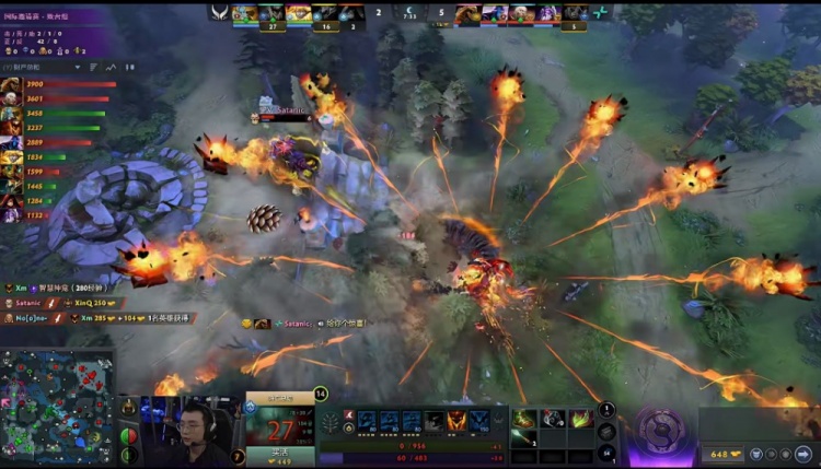 【7分钟】Dukalis上古巨神和Satanic噬魂鬼一同过来抢经验符,XG除了Ame幻影长矛手都过来帮忙,在击杀上古巨神后,xm影魔没有蓝,噬魂鬼钻野出来配合Noone卡尔天火将四人全部击杀,XG被打一波1换4,经济落后3K。