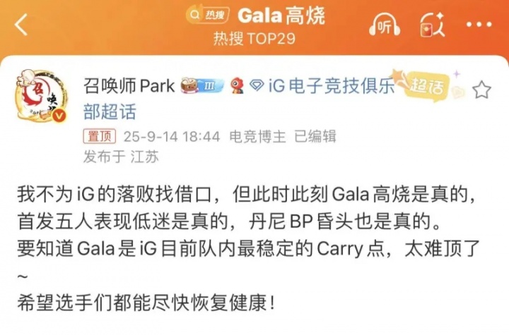 直播吧9月14日讯 在今日的LPL季后赛上,iG以0-3的比分不敌AL惨遭淘汰,赛后有媒体人发文,疑似GALA顶着高烧进行比赛!