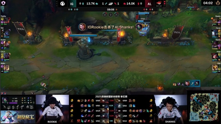 【10:54】Rookie杰斯下路吃线被Shanks阿卡丽挂E完美单杀,随后AL众人支援到位,Wei塞拉斯投到阿卡丽大招被反杀,AL打出0换2。