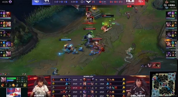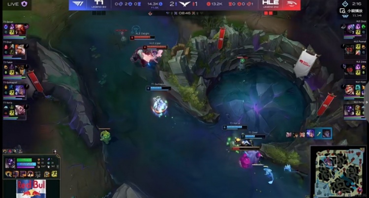 【22:40】龙魂团,Delight牛头强开想配合绕后的Zeka塞拉斯,但是正面T1野辅完美双大反开瞬间秒了HLE三个!残局Viper斯莫德一打三不但抢到了小龙!还强行换掉了T1一个!这波T1打出3换5团灭HLE!但是没拿到龙魂!