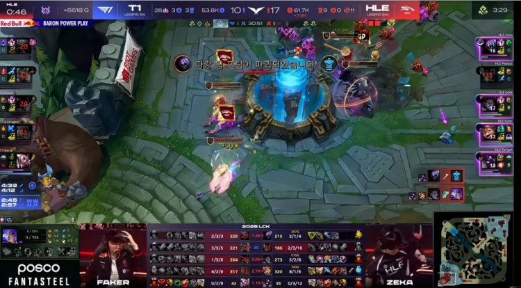 【30:00】HLE高地团打出0换2,拆掉两路高地!正面团没人扛得住300多层的Viper斯莫德输出啊!HLE一边打伤害一边推塔,直接结束掉了本场BO5,横扫T1的同时成为LCK第三支锁定世界赛资格的队伍!