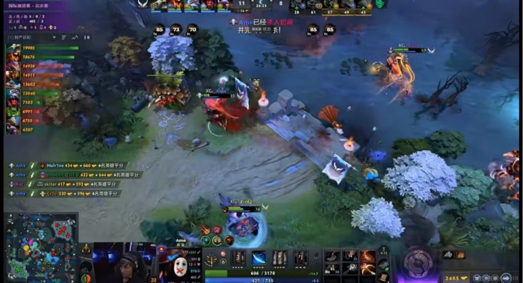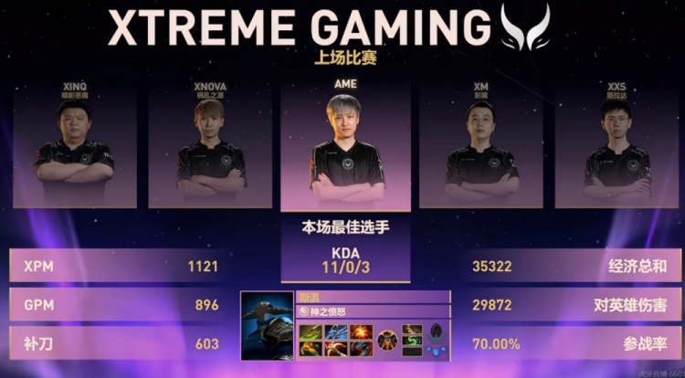 天辉XG:XinQ暗影恶魔、xNova祸乱之源、Xm影魔、Xxs大鱼人、Ame斯温