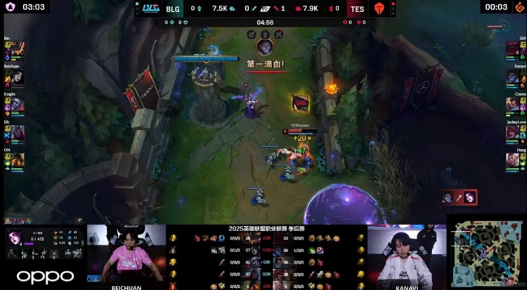 【13:43】野区遭遇,BLG想要依靠人数优势动手,但是Kanavi塞拉斯直接后排一打三切死了Beichuan莫甘娜!TES支援帮助Kanavi塞拉斯拿下三杀!镜头一转Kanavi塞拉斯配合队友再打出0换2,回头拿下峡谷先锋!