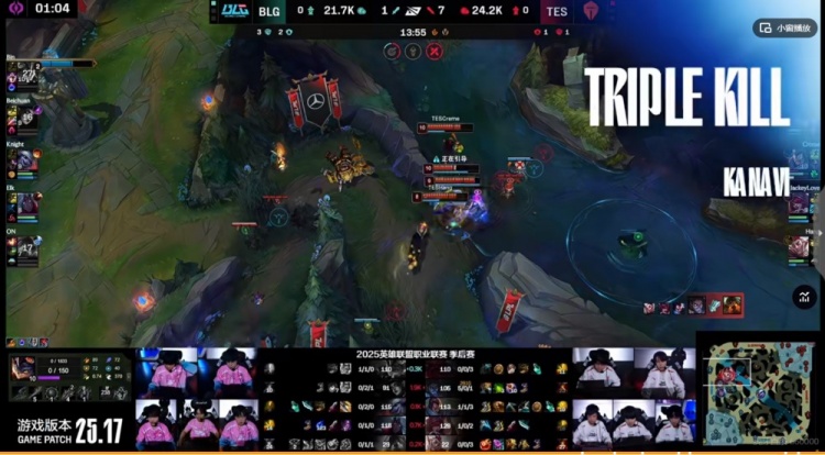 【22:00】TES直接冲锋无视视野开团,冲上高地秒掉BLG野辅!拆掉下路高地!Kanavi塞拉斯回马枪链住Bin兰博将他切死,又配合队友再秒Beichuan莫甘娜!15杀了!