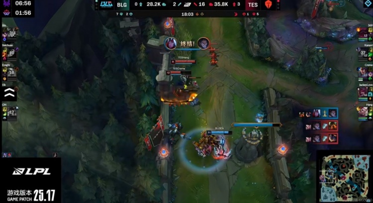 【17:40】野区遭遇Kanavi塞拉斯带队冲锋逐个击破,顶着Bin兰博大招越塔击杀BLG四人!虽然Elk维鲁斯配合防御塔击杀掉了Kanavi塞拉斯拿下一千块!但是BLG的中下二塔都被推掉了!