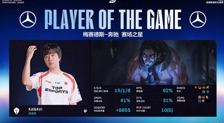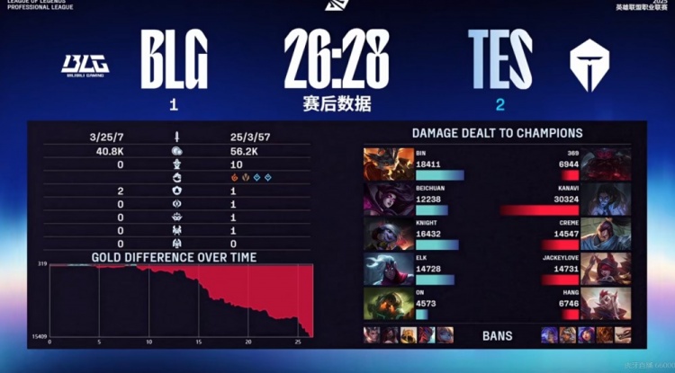 第三局Kanavi塞拉斯4分钟入侵野区单杀Beichuan莫甘娜提前启动!13分钟野区团Kanavi塞拉斯更是后排一打三切死Beichuan莫甘娜之后拿下三杀!这个时间的塞拉斯已经拦不住了!BLG根本没人看得懂他!随后Kanavi更是无法无天,直接带队冲锋,踩在Bin兰博大招上帮助队伍击杀BLG四人!随后又是他偷兰博大招配合哥哥霞倒钩反击0换3,经济差一波一波被拉开,BLG完全没有反击的余地!最终TES拿下大龙+电龙魂,拆掉三路高地,26分钟结束比赛,先拿赛点!
