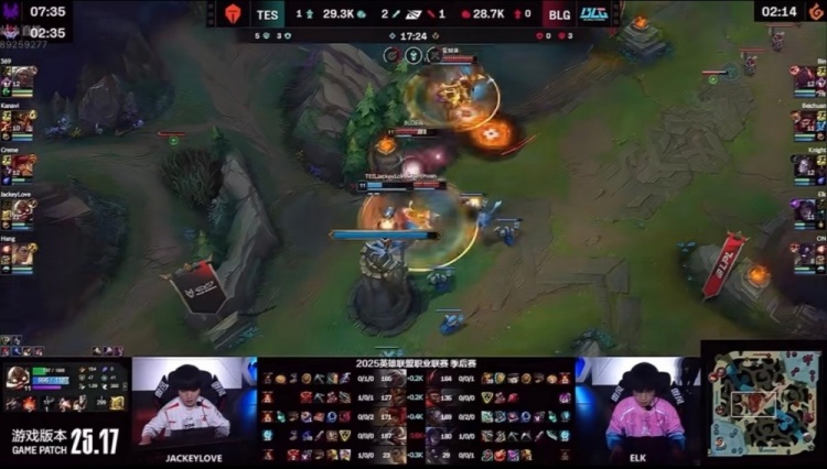 第二局TES前期依然打的相当主动拿下经济优势!但是BLG中期也是耐心运营没有让经济差被拉开!双方你来我往,但是JKL在上局几乎一样的位置白给了一次,送给Elk希维尔一个免费击杀!