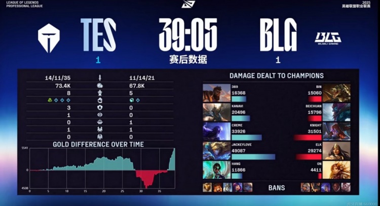 大龙团又是JackeyLove伊泽瑞尔回城被断,BLG打出0换2之后围绕大龙减员TES拿下大龙反拆双二塔,经济一度反超5K!但是关键时候Kanavi潘森+JKL伊泽瑞尔发力帮助队伍打出0换2顶住局势!随后又是JKL伊泽瑞尔Poke伤害打满!TES拿下电龙魂之后回头接大龙团,ON曙光+knight阿萝拉倒下,TES拿下大龙之后JKL伊泽瑞尔交闪向前切死Elk希维尔!BLG始终人不齐啊!TES四人中路强留Bin鳄鱼,一波结束比赛扳平了比分!