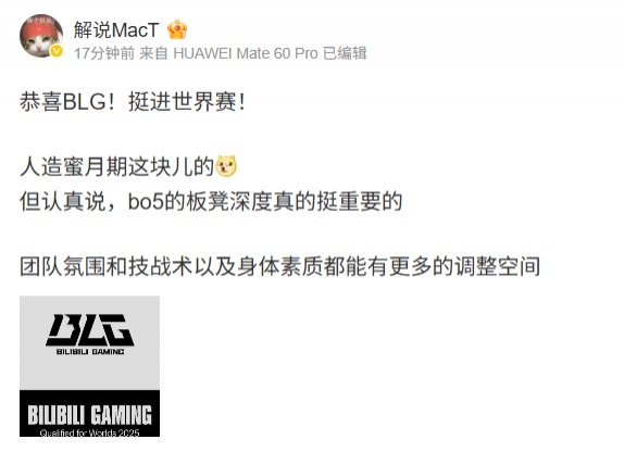 直播吧9月15日讯 LPL季后赛BLG 3-2 TES,解说MacT赛后发文:恭喜BLG!挺进世界赛!