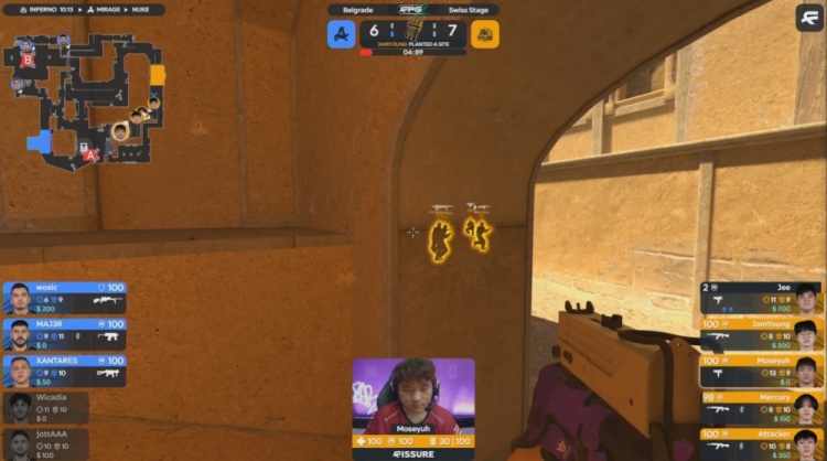 第12局回到长枪,中路VIP封烟,Moseyuh摸烟与Merucry各杀一人,jottaaa反杀小鞠与Mercury,随后Moseyuh回B,Wicadia来B带走Moseyuh,woxic大狙轰掉Jee,Aurora6-6Tyloo。