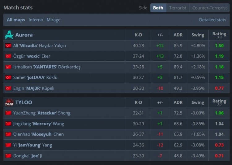 易边再战,手枪局Tyloo拱门夹A,Jee格洛克双杀,Tyloo在A下包,残局小鞠先杀Maj3r再杀jottaaa,Aurora6-7Tyloo。