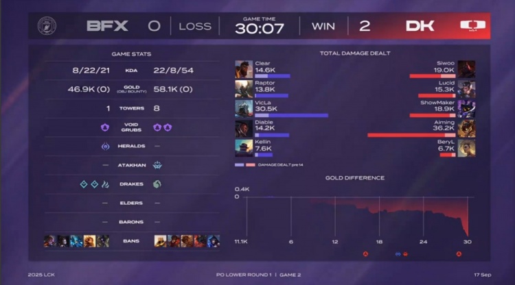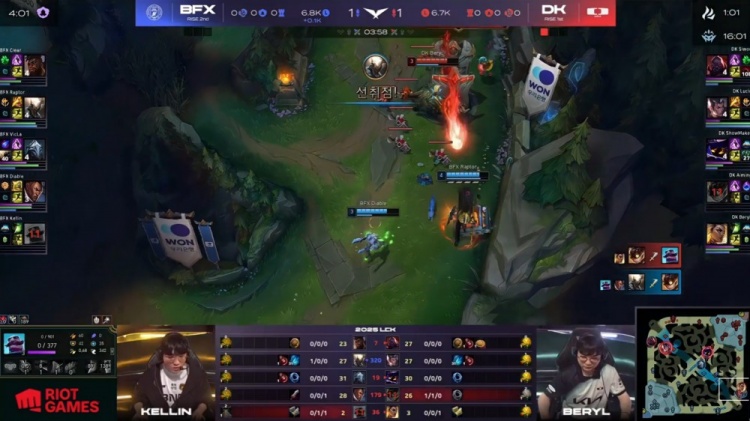 第二局前期Raptor潘森和Kellin布隆在下路越塔击杀Aiming吉格斯后被反杀,Siwoo赛恩和Lucid赵信在巢虫处击杀Raptor潘森并拿到双杀,BeryL芮尔在野区开到BFX两人后,Lucid赵信拿下小龙,DK取得经济优势。