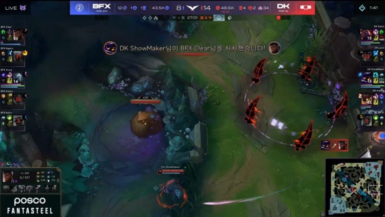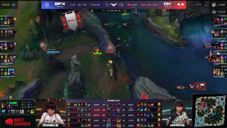 中期许哥小法配合Lucid赵信在野区击杀Raptor潘森,Aiming吉格斯和许哥小法在先锋处连续击杀Clear奎桑提与VicLa维克托后,DK团灭BFX。
