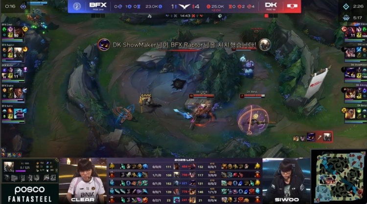 【24:20】许哥小法下路绕后,正面Siwoo赛恩吸引,Clear侧面来下,双方继续河道拉扯,Clear奎桑提被许哥小法圈框住击杀,DK经济领先4.5k。