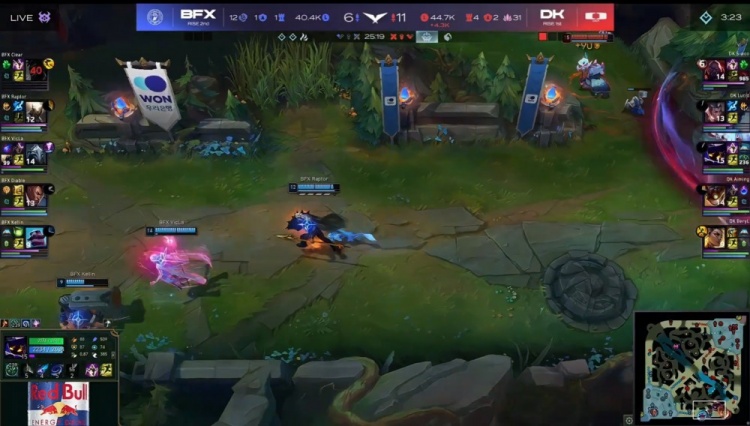 后期Raptor潘森开车进场目送Lucid赵信吃掉厄塔汗,Aiming吉格斯和许哥小法持续推进击杀Clear奎桑提等人,最终Aiming吉格斯三分球击杀Kellin布隆,DK团灭BFX,一波推平BFX基地再下一城。