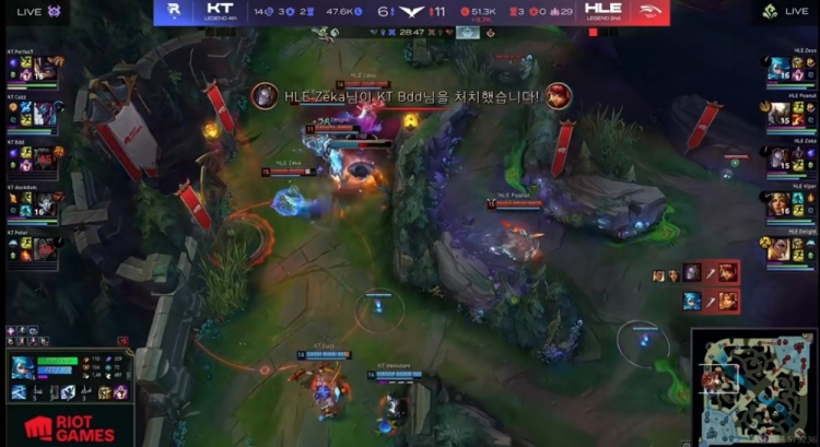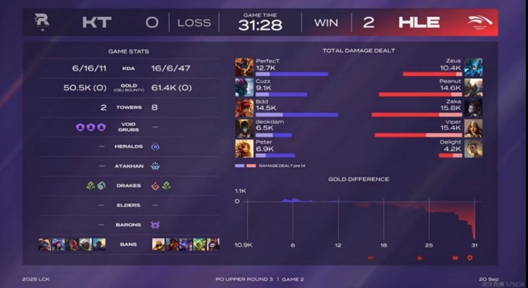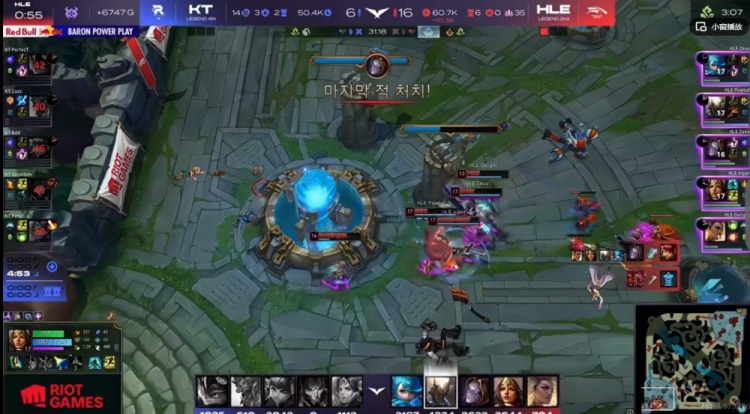 第二局比赛开局Peanut潘森下路站岗开送,KT一度拿下前期的主动权!但是中期运营HLE也不落下风,三核心都在稳步发育,几次团战Peanut潘森和Zeka发条盯着Bdd安妮开,让KT毫无主动打团的机会啊!拿下厄塔汗之后Peanut潘森团战砍下四杀,HLE拉开经济差之后不给机会,上路逮捕KT中辅再拿大龙!最终高地团Delight芮尔闪现开团,HLE三核毫无压力输出清扫战场,一波0换5结束比赛!拿下三个赛点!